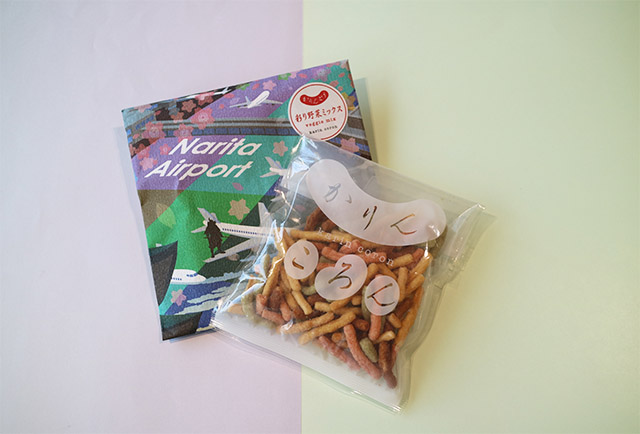 かりんとうと豆菓子の専門店「かりんころん」の成田空港限定商品。かりんとうのフレーバーには黒蜜、彩り野菜、おとなのわさび、蜜絡めピーナッツと4種類がラインナップ。ジップロックに入っているのも嬉しいポイントです。成田空港と日本をイメージしたポップなパッケージは、柔軟性のある丈夫な和紙でできています。食べ終わった後はブックカバーやラッピングペーパーとしても使えます。